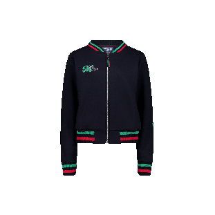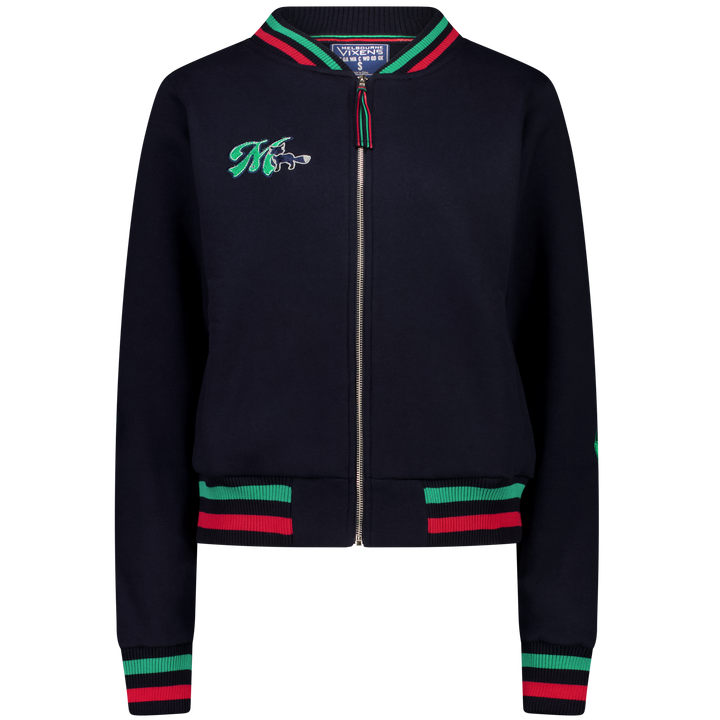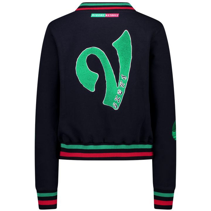 Bomber Jacket with silicone print front chest fox logo, netball embroidery on elbow, stripe rib trim, poly/cotton brushed fleece